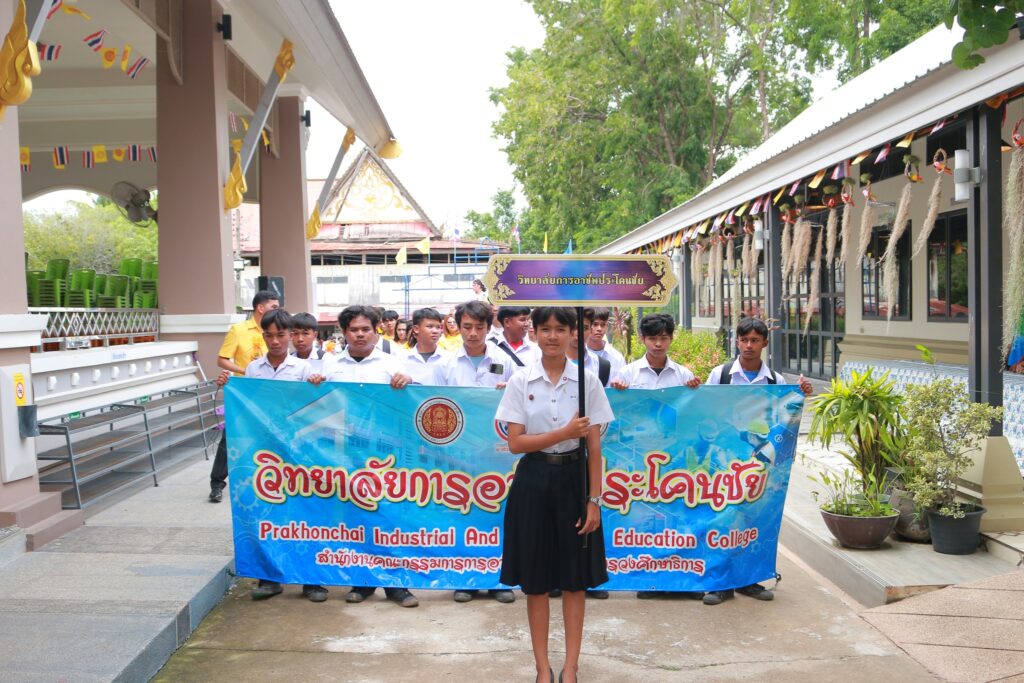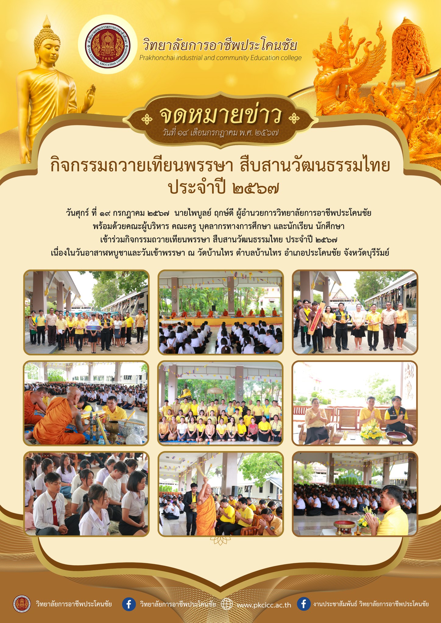 วันศุกร์ ที่ ๑๙ กรกฎาคม ๒๕๖๗ นายไพบูลย์ ฤกษ์ดี ผู้อำนวยการวิทยาลัยการอาชีพประโคนชัย พร้อมด้วยคณะผู้บริหาร คณะครู บุคลากรทางการศึกษา และนักเรียน นักศึกษา เข้าร่วมกิจกรรมถวายเทียนพรรษา สืบสานวัฒนธรรมไทย ประจำปี ๒๕๖๗ เนื่องในวันอาสาฬหบูชาและวันเข้าพรรษา ณ วัดบ้านไทร ตำบลบ้านไทร อำเภอประโคนชัย จังหวัดบุรีรัมย์