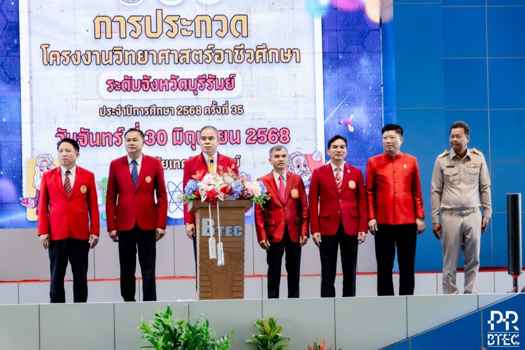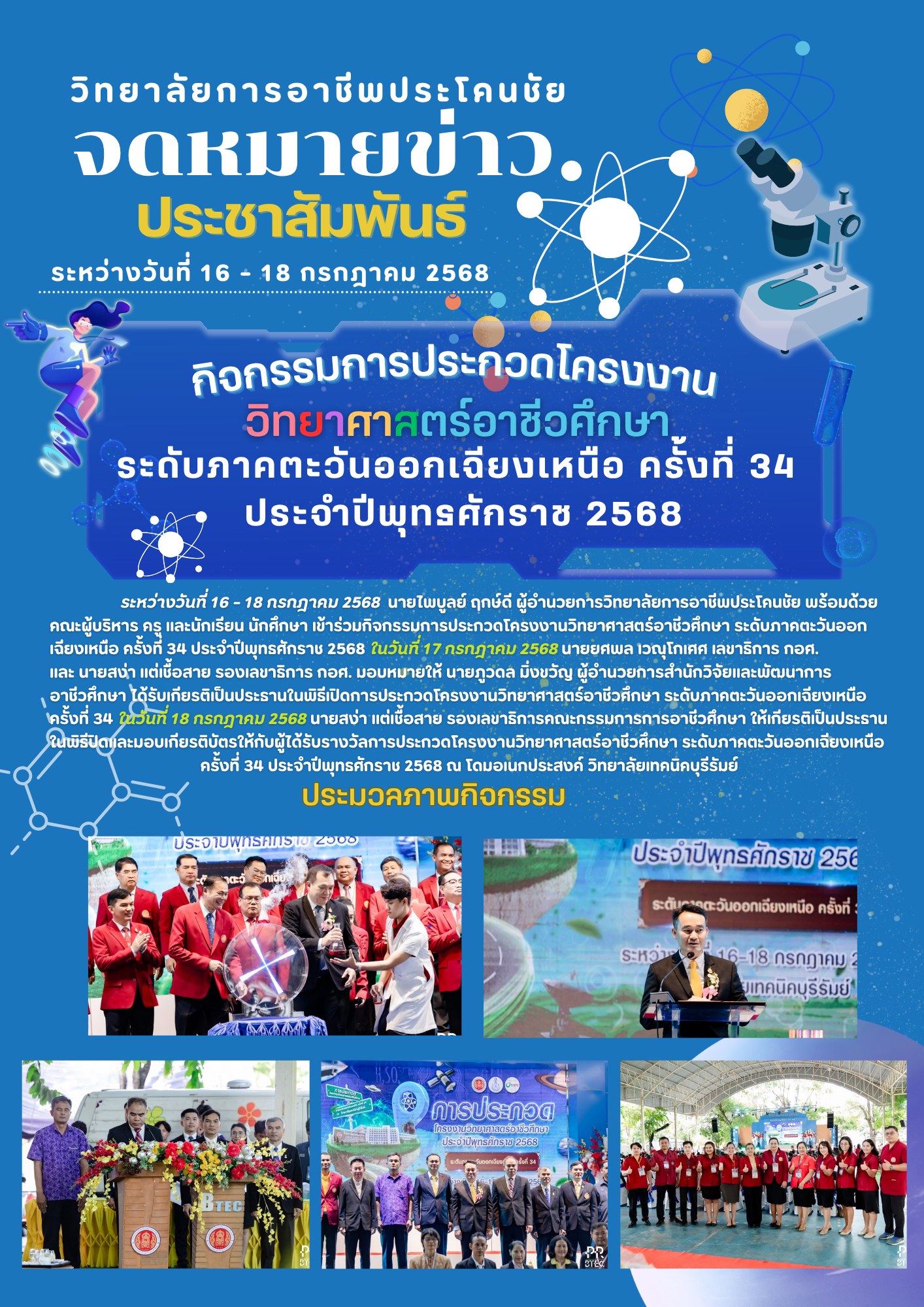 ระหว่างวันที่ 16 – 18 กรกฎาคม 2568 นายไพบูลย์ ฤกษ์ดี ผู้อำนวยการวิทยาลัยการอาชีพประโคนชัย พร้อมด้วยคณะผู้บริหาร ครู และนักเรียน นักศึกษา เข้าร่วมกิจกรรมการประกวดโครงงานวิทยาศาสตร์อาชีวศึกษา ระดับภาคตะวันออกเฉียงเหนือ ครั้งที่ 34 ประจำปีพุทธศักราช 2568 ในวันที่ 17 กรกฎาคม 2568 นายยศพล เวณุโกเศศ เลขาธิการ กอศ. และ นายสง่า แต่เชื้อสาย รองเลขาธิการ กอศ. มอบหมายให้ นายภูวดล มิ่งขวัญ ผู้อำนวยการสำนักวิจัยและพัฒนาการอาชีวศึกษา ได้รับเกียรติเป็นประธานในพิธีเปิดการประกวดโครงงานวิทยาศาสตร์อาชีวศึกษา ระดับภาคตะวันออกเฉียงเหนือ ครั้งที่ 34 ในวันที่ 18 กรกฎาคม 2568 นายสง่า แต่เชื้อสาย รองเลขาธิการคณะกรรมการการอาชีวศึกษา ให้เกียรติเป็นประธานในพิธีปิดและมอบเกียรติบัตรให้กับผู้ได้รับรางวัลการประกวดโครงงานวิทยาศาสตร์อาชีวศึกษา ระดับภาคตะวันออกเฉียงเหนือ ครั้งที่ 34 ประจำปีพุทธศักราช 2568 ณ โดมอเนกประสงค์ วิทยาลัยเทคนิคบุรีรัมย์