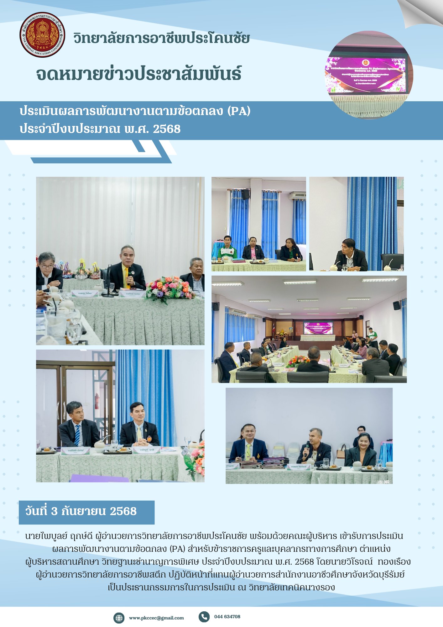 วันที่ 3 กันยายน 2568 นายไพบูลย์ ฤกษ์ดี ผู้อำนวยการวิทยาลัยการอาชีพประโคนชัย พร้อมด้วยคณะผู้บริหาร เข้ารับการประเมินผลการพัฒนางานตามข้อตกลง (PA) สำหรับข้าราชการครูและบุคลากรทางการศึกษา ตำแหน่งผู้บริหารสถานศึกษา วิทยฐานะชำนาญการพิเศษ ประจำปีงบประมาณ พ.ศ. 2568 โดยนายวิโรจณ์ ทองเรือง ผู้อำนวยการวิทยาลัยการอาชีพสตึก ปฏิบัติหน้าที่แทนผู้อำนวยการสำนักงานอาชีวศึกษาจังหวัดบุรีรัมย์ เป็นประธานกรรมการในการประเมิน ณ วิทยาลัยเทคนิคนางรอง