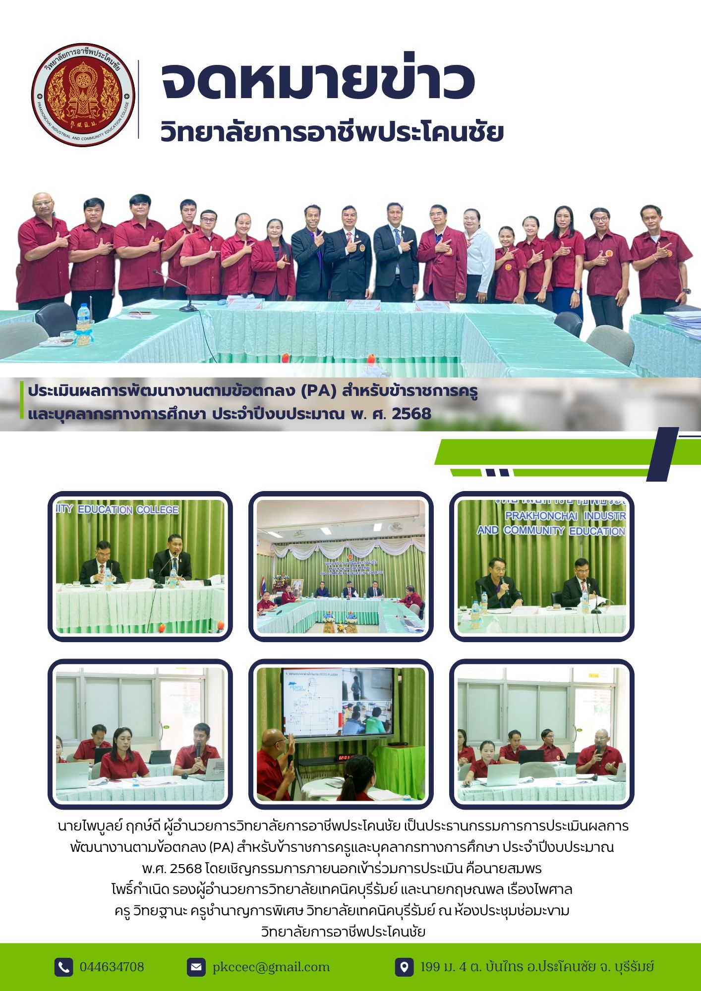 นายไพบูลย์ ฤกษ์ดี ผู้อำนวยการวิทยาลัยการอาชีพประโคนชัย เป็นประธานกรรมการการประเมินผลการพัฒนางานตามข้อตกลง (PA) สำหรับข้าราชการครูและบุคลากรทางการศึกษา ประจำปีงบประมาณ พ.ศ. 2568 โดยเชิญกรรมการภายนอกเข้าร่วมการประเมิน คือนายสมพร โพธิ์กำเนิด รองผู้อำนวยการวิทยาลัยเทคนิคบุรีรัมย์ และนายกฤษณพล เรืองไพศาล ครู วิทยฐานะ ครูชำนาญการพิเศษ วิทยาลัยเทคนิคบุรีรัมย์ ณ ห้องประชุมช่อมะขาม วิทยาลัยการอาชีพประโคนชัย