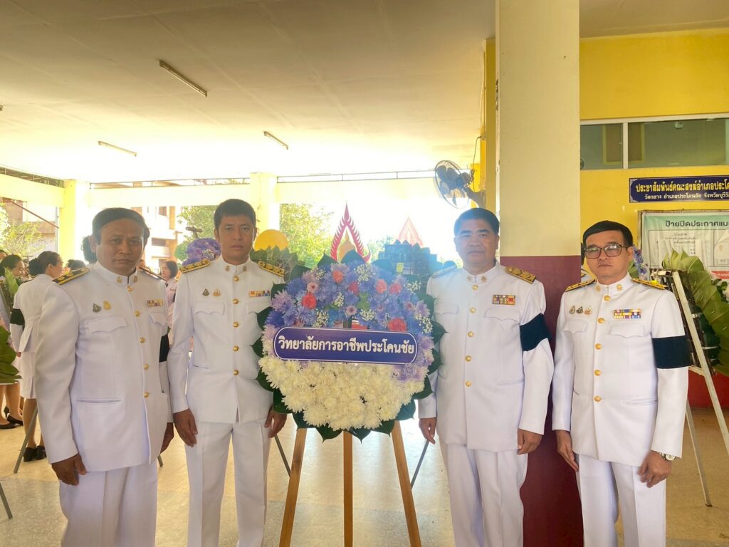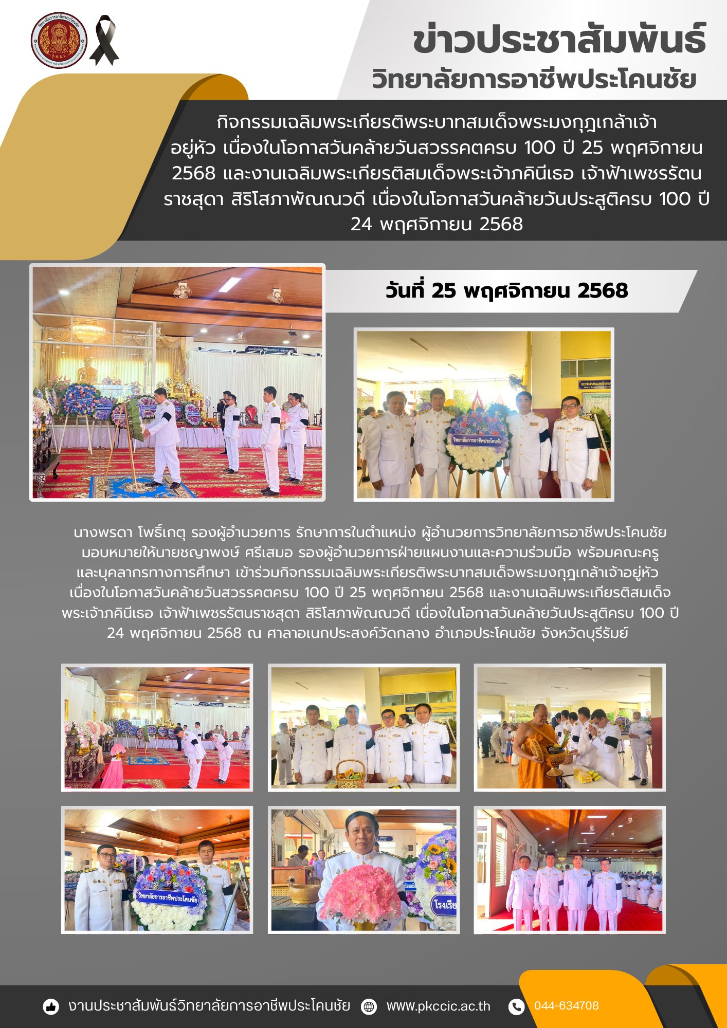 นางพรดา โพธิ์เกตุ รองผู้อำนวยการ รักษาการในตำแหน่ง ผู้อำนวยการวิทยาลัยการอาชีพประโคนชัย มอบหมายให้นายชญาพงษ์ ศรีเสมอ รองผู้อำนวยการฝ่ายแผนงานและความร่วมมือ พร้อมคณะครูและบุคลากรทางการศึกษา เข้าร่วมกิจกรรมเฉลิมพระเกียรติพระบาทสมเด็จพระมงกุฎเกล้าเจ้าอยู่หัว เนื่องในโอกาสวันคล้ายวันสวรรคตครบ 100 ปี 25 พฤศจิกายน 2568 และงานเฉลิมพระเกียรติสมเด็จพระเจ้าภคินีเธอ เจ้าฟ้าเพชรรัตนราชสุดา สิริโสภาพัณณวดี เนื่องในโอกาสวันคล้ายวันประสูติครบ 100 ปี 24 พฤศจิกายน 2568 ณ ศาลาอเนกประสงค์วัดกลาง อำเภอประโคนชัย จังหวัดบุรีรัมย์