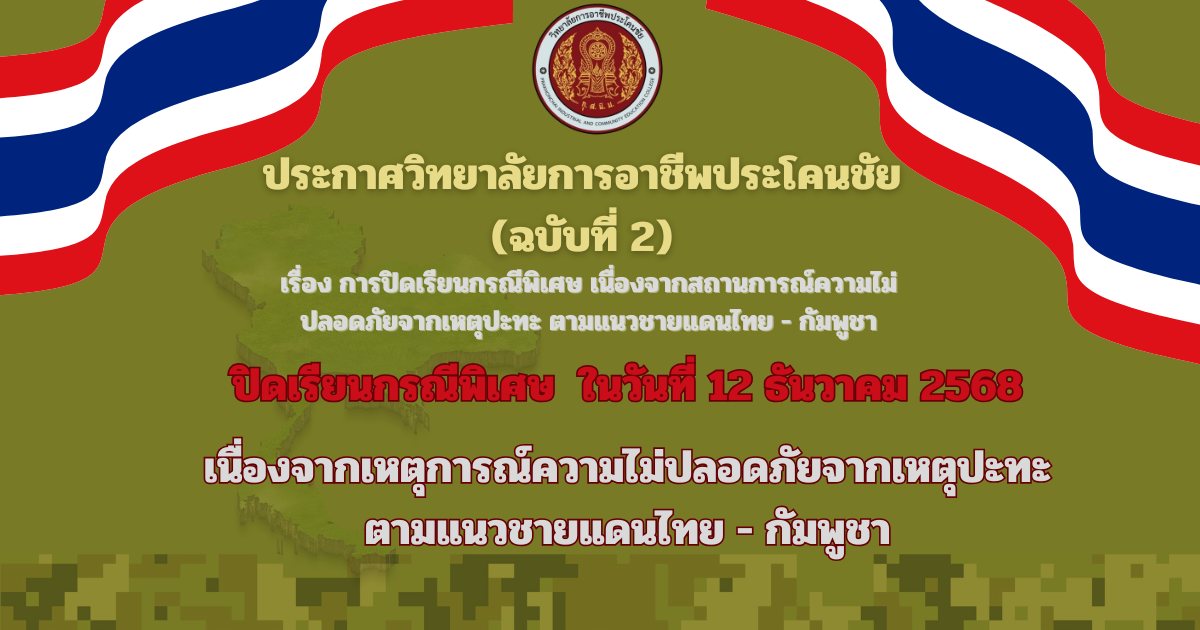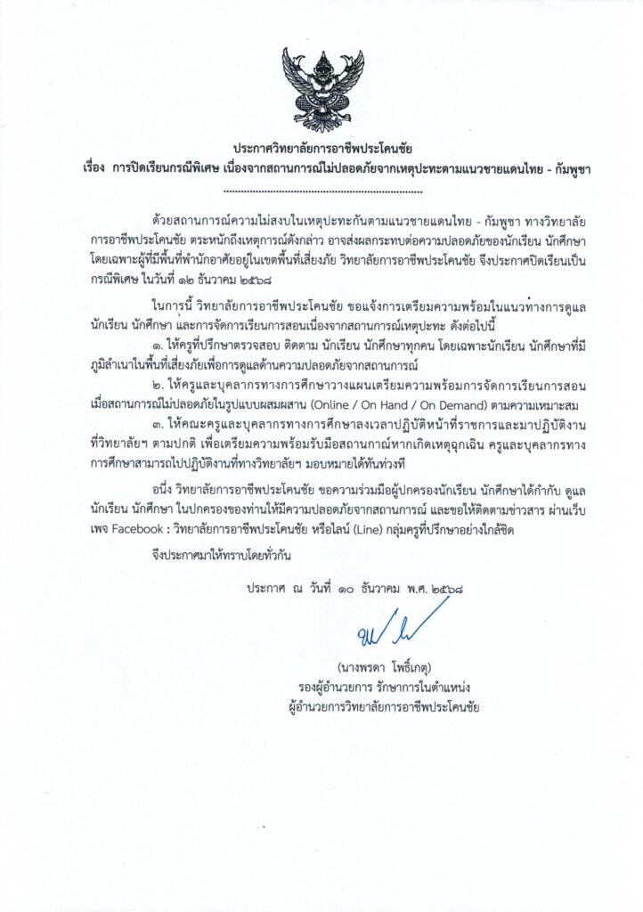 ประกาศวิทยาลัยการอาชีพประโคนชัย เรื่องการปิดเรียนกรณีพิเศษ เนื่องจากสถานการณ์ไม่ปลอดภัยจากเหตุปะทะตามแนวชายแดนไทย-กัมพูชา