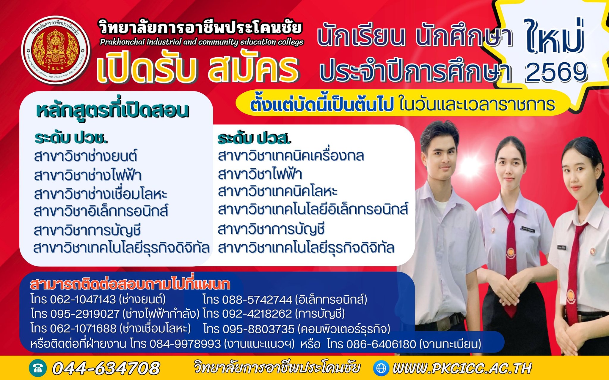 สอบถามรายละเอียดเพิ่มเพิ่ม 044-634708 หรือ 0849978993 งานแนะแนว เว็บไซค์ วิทยาลัยฯ : https://pkcicc.ac.th/