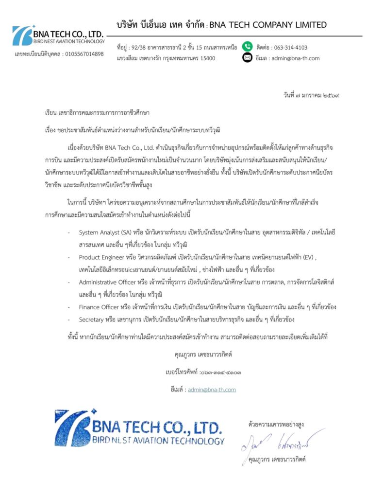 เนื่องด้วยบริษัท BNA Tech Co. , Ltd ดำเนินธุรกิจเกี่ยวกับการจำหน่ายอุปกรณ์พร้อมติดตั้งให้แก่ลูกค้าทางด้านธุรกิจการบิน และมีความประสงค์เปิดรับสมัครพนักงานใหม่จำนวนมาก โดยบริษัทเปิดรับนักศึกษาระดับ ประกาศนียบัตรวิชาชีพ (ปวช.) และประกาศนียบัตรวิชาชีพชั้นสูง (ปวส.) ตามตำแหน่งสายงาน ดังนี้
