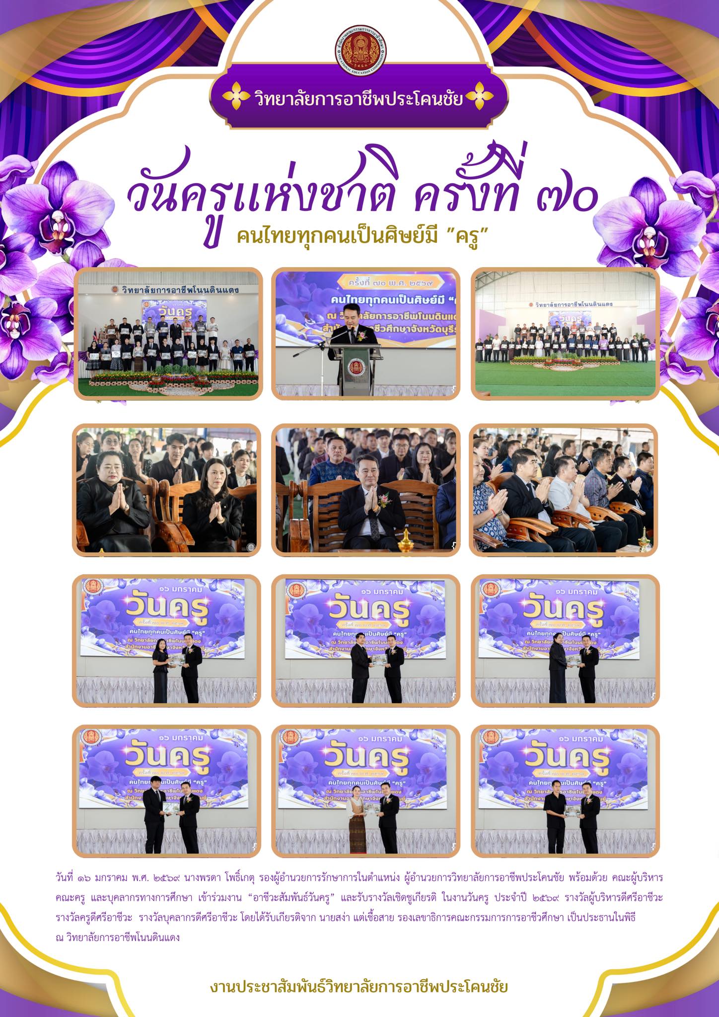 วันที่ ๑๖ มกราคม พ.ศ. ๒๕๖๙ นางพรดา โพธิ์เกตุ รองผู้อำนวยการรักษาการในตำแหน่ง ผู้อำนวยการวิทยาลัยการอาชีพประโคนชัย พร้อมด้วย คณะผู้บริหาร คณะครู และบุคลากรทางการศึกษา เข้าร่วมงาน “อาชีวะสัมพันธ์วันครู” และรับรางวัลเชิดชูเกียรติ ในงานวันครู ประจำปี ๒๕๖๙ รางวัลผู้บริหารดีศรีอาชีวะ รางวัลครูดีศรีอาชีวะ รางวัลบุคลากรดีศรีอาชีวะ โดยได้รับเกียรติจาก นายสง่า แต่เชื้อสาย รองเลขาธิการคณะกรรมการการอาชีวศึกษา เป็นประธานในพิธี ณ วิทยาลัยการอาชีพโนนดินแดง