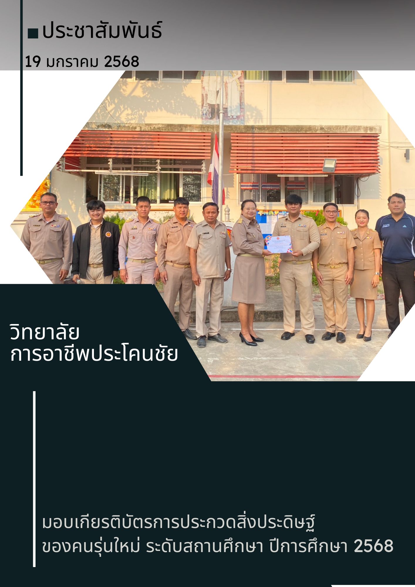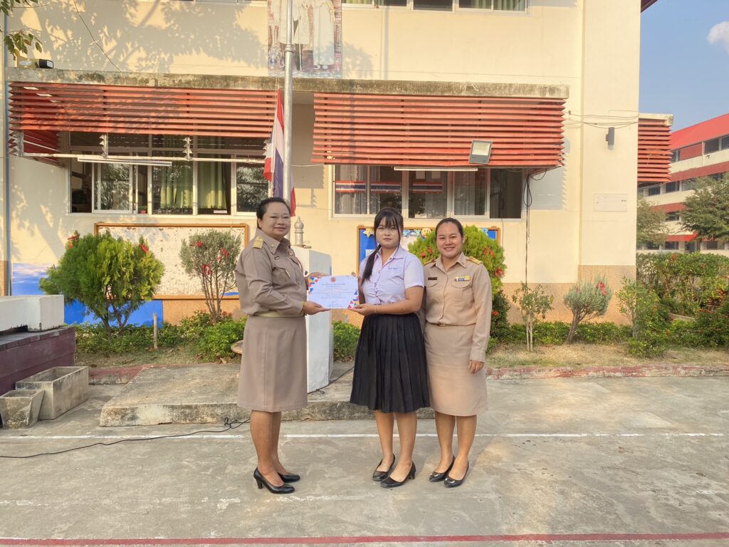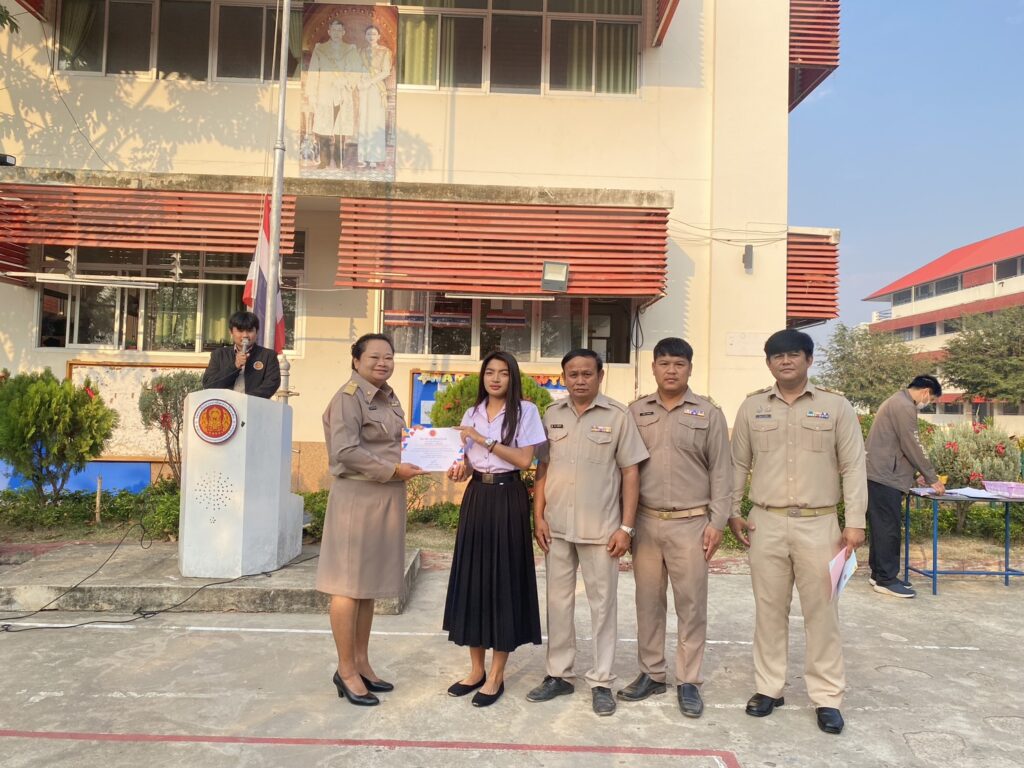 บรรยากาศการเข้าแถวเคารพธงชาติประจำสัปดาห์ที่ 14 โดยในโอกาสนี้ นางพรดา โพธิ์เกตุ รองผู้อำนวยการ รักษาการในตำแหน่งผู้อำนวยการวิทยาลัยการอาชีพประโคนชัย ได้ให้เกียรติมอบเกียรติบัตรแก่ผู้ชนะการประกวดกิจกรรมสิ่งประดิษฐ์ของคนรุ่นใหม่ ระดับสถานศึกษา ประจำปีการศึกษา 2568 แก่นักเรียนและนักศึกษา และคณะกรรมการที่ร่วมตัดสินสิ่งประดิษฐิ์ทุกประเภท