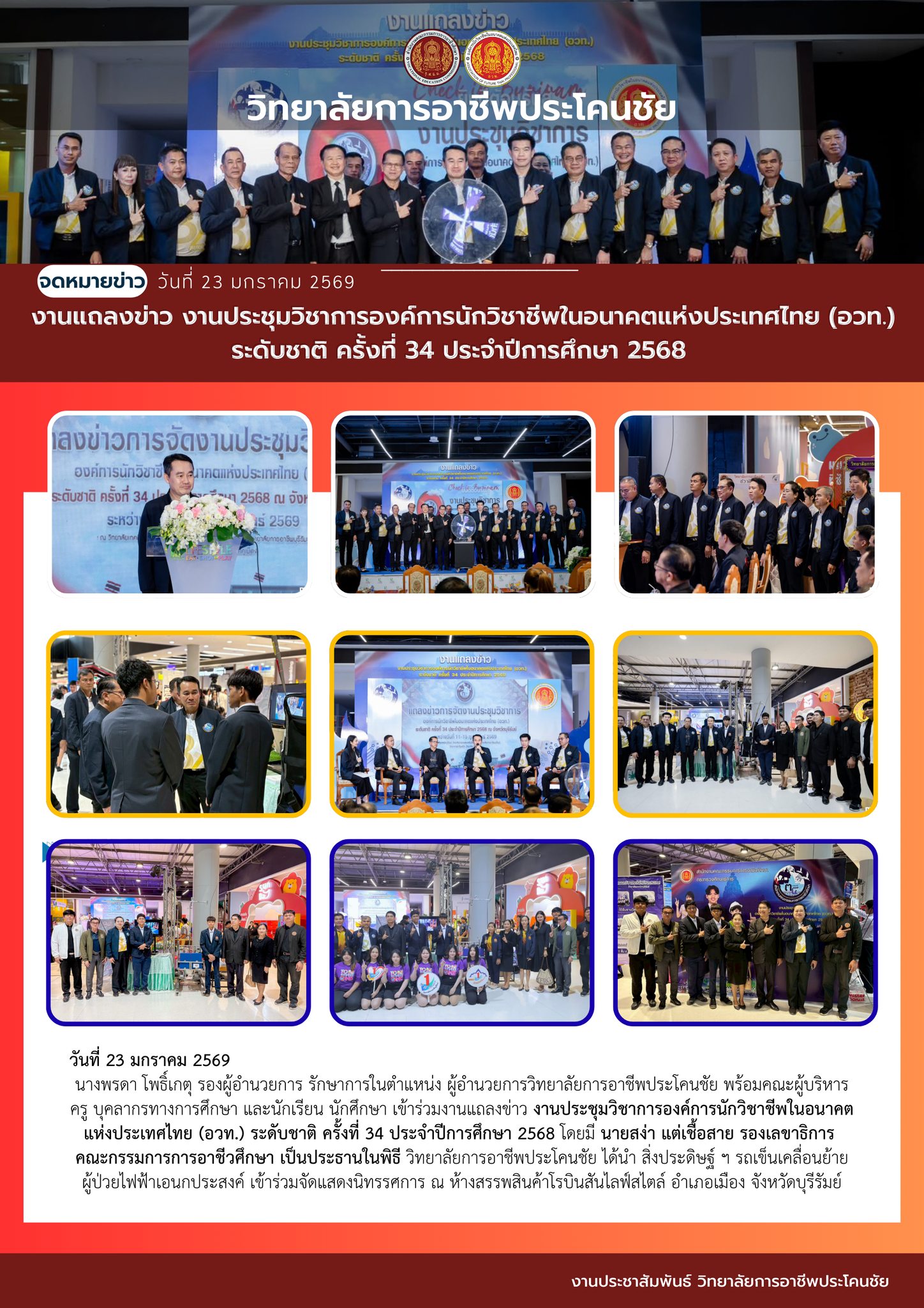 วันที่ 23 มกราคม 2569นางพรดา โพธิ์เกตุ รองผู้อำนวยการ รักษาการในตำแหน่ง ผู้อำนวยการวิทยาลัยการอาชีพประโคนชัย พร้อมคณะผู้บริหาร ครู บุคลากรทางการศึกษา และนักเรียน นักศึกษา เข้าร่วมงานแถลงข่าว งานประชุมวิชาการองค์การนักวิชาชีพในอนาคตแห่งประเทศไทย (อวท.) ระดับชาติ ครั้งที่ 34 ประจำปีการศึกษา 2568 โดยมี นายสง่า แต่เชื้อสาย รองเลขาธิการ คณะกรรมการการอาชีวศึกษา เป็นประธานในพิธี วิทยาลัยการอาชีพประโคนชัย ได้นำ สิ่งประดิษฐ์ ฯ รถเข็นเคลื่อนย้ายผู้ป่วยไฟฟ้าเอนกประสงค์ เข้าร่วมจัดแสดงนิทรรศการ ณ ห้างสรรพสินค้าโรบินสันไลฟ์สไตล์ อำเภอเมือง จังหวัดบุรีรัมย์