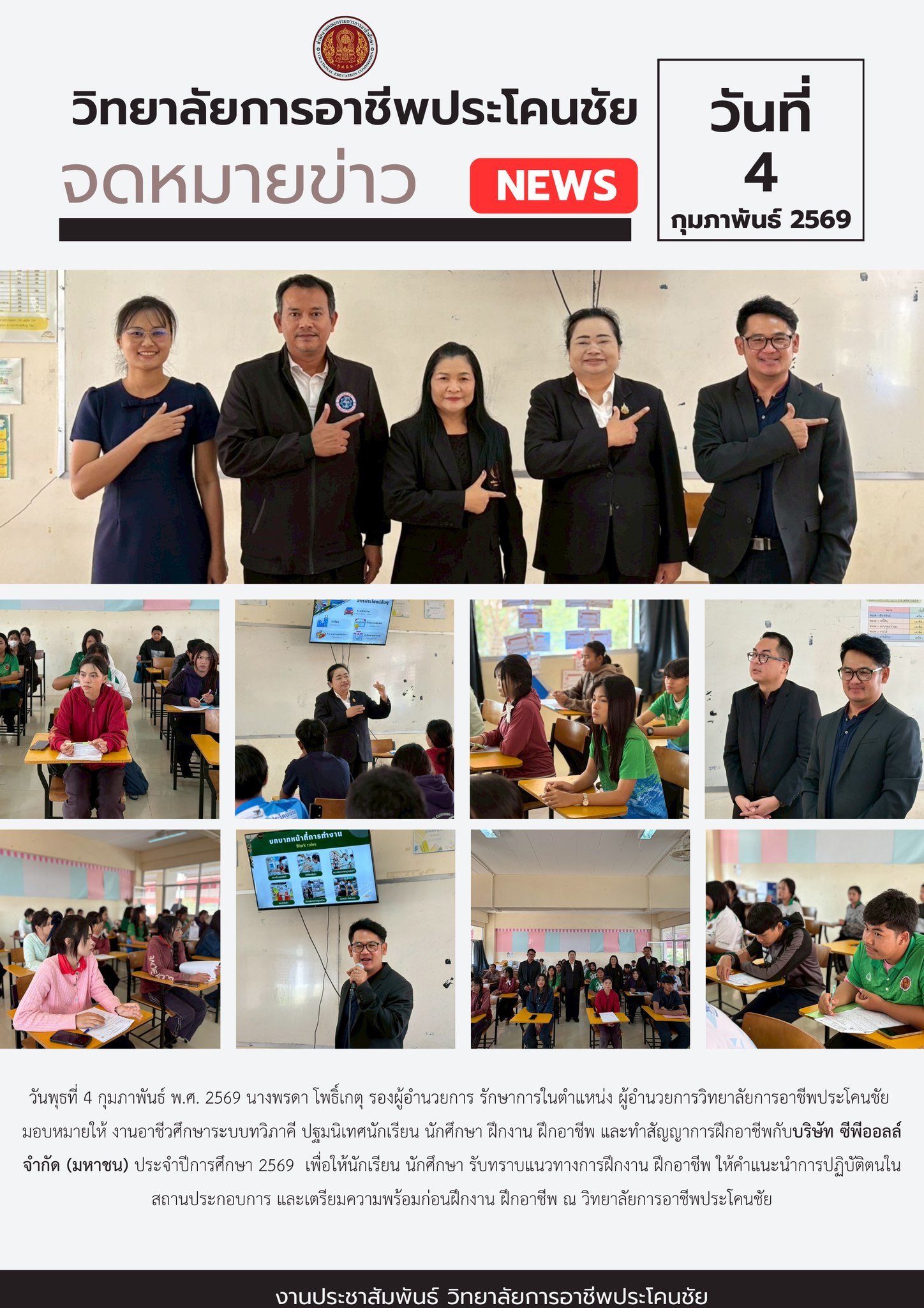 มอบหมายให้ งานอาชีวศึกษาระบบทวิภาคี ปฐมนิเทศนักเรียน นักศึกษา ฝึกงาน ฝึกอาชีพ และทำสัญญาการฝึกอาชีพกับบริษัท ซีพีออลล์ จำกัด (มหาชน) ประจำปีการศึกษา 2569 เพื่อให้นักเรียน นักศึกษา รับทราบแนวทางการฝึกงาน ฝึกอาชีพ ให้คำแนะนำการปฏิบัติตนในสถานประกอบการ และเตรียมความพร้อมก่อนฝึกงาน ฝึกอาชีพ ณ วิทยาลัยการอาชีพประโคนชัย